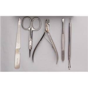 Deluxe travel kit includes nail file, grooming scissor, cuticle nipper, slant tweezer and whitehead/blackhead extractor. Comes in a 3 x 5 compact travel case. Stainless Steel.