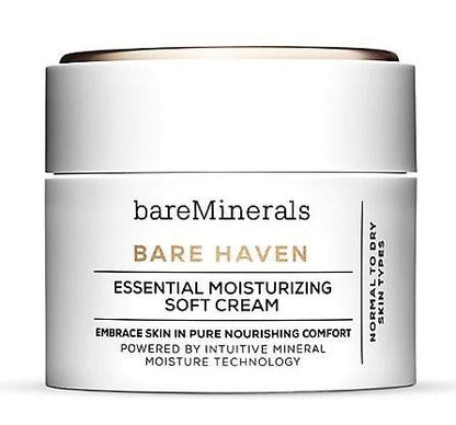 Embrace your skin in silky-soft, lusciously nourishing moisture. Powered by Intuitive Mineral Moisture Technology, Bare Haven Essential Moisturizing Soft Cream replenishes essential moisture to normal to dry skin, reviving overall resilience and suppleness and infusing an extraordinarily super-smooth feel. This comforting soft cream moisturizer effortlessly blends into skin to help enhance a natural, healthy-looking glow. Plus, a blend of peptides, ceramides and amino acids to help soften rough texture, while reducing the appearance of fine lines and wrinkles. The subtle notes of Bergamot and Eucalyptus* add to the sensory experience to gently enliven and awaken your senses.