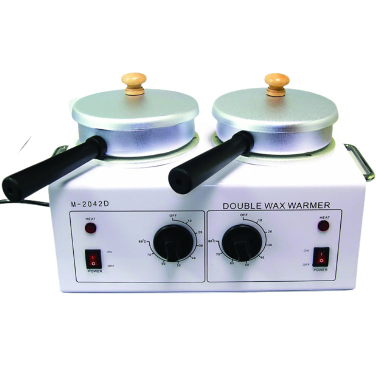 Thermostat controlled double wax warmer with removable wax pots. Each pot can be individually controlled and turned on/off. Can be used for depilatory or paraffin wax. Pot covers keep heat sealed in. Heats up to 176°F(80°C). Holds both 8 oz. and 14 oz. cans. Base measures 11-3/4 inch L x 7 inch W.
