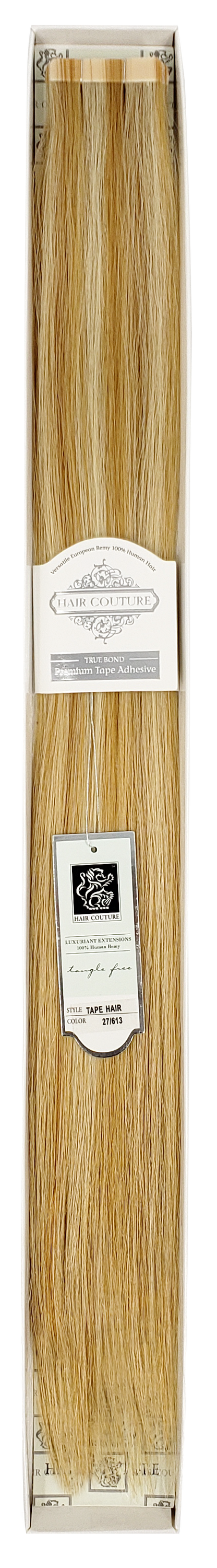 Tape Extensions: Hair Couture Tape Extensions apart from its competitors is beautiful blonde colorways, quality double-drawn remy hair, and medical grade adhesive bond. Clean install and removal. Our bond "sandwich" process uses no heat or equipment, just a rattail comb.
