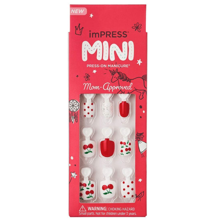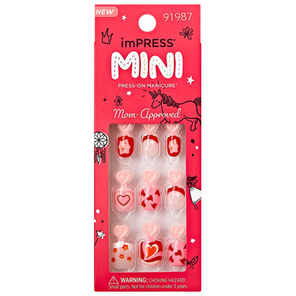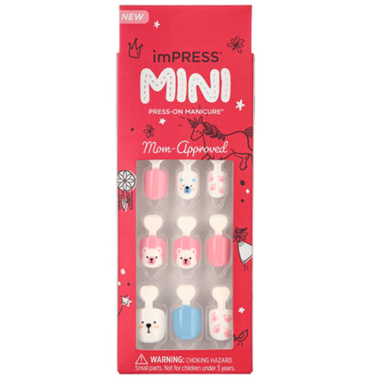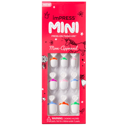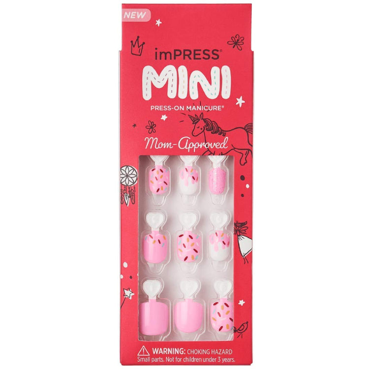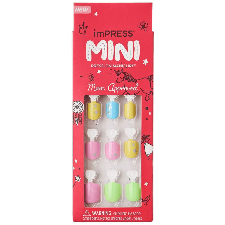 Impress Mini Press-on Manicure Press-on Nails For Kids! For Both Beauty And Play! Mom-approved nails are super comfortable and do not damage natural nails. This kiddie press-on does not require glue, is safe on natural nails, and removal is hassle-free. Eco-friendly recyclable packaging printed with soy ink.