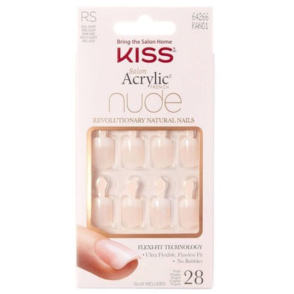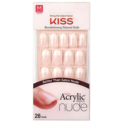 Kiss Salon Acrylic Nude French Manicure is the easiest and quickest way to get a perfect, professional-looking French nude manicure at home. Features short-length, oval-shaped glue-on nails with a bubble-free, flawless finish. The nails are thinner at the cuticle for a seamless look. These DIY Fake nails have the look and strength of salon acrylics, but the glue is on in minutes and requires no curing lights. Acrylic-infused technology makes the nails super durable so they never chip.