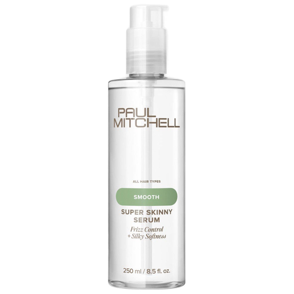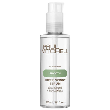 Blow-dry hair in less time with Paul Mitchell Super Skinny Serum! This best-selling blowout primer helps protect hair from heat with up to 450°F thermal heat protection and reduced drying time, so you get silky-smooth results faster. The humidity-resistant formula contains lightweight silicones that absorb into hair without weighing it down and seal the cuticle, leaving hair frizz-free in any weather. Simply rub one pump of the Paul Mitchell smoothing hair serum into your hands and apply it to clean, damp hair before drying for smooth, shiny strands.