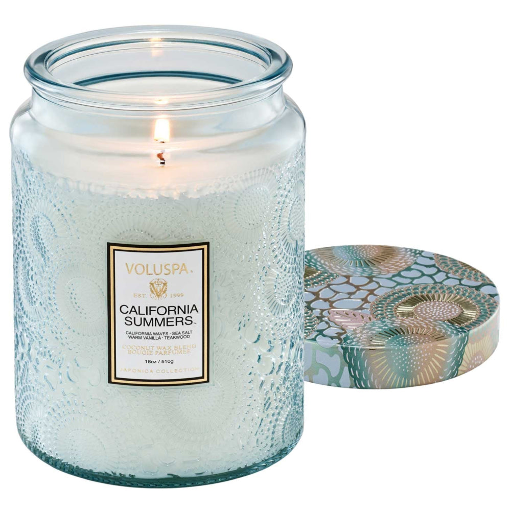 Voluspa's unique embossed glass vessel is topped with a metal lid, adorned with Japonica detailing that keeps the candle dust-free when not in use. The single wick allows you to enjoy fragrance throw for 100 hours. Our candles are hand-poured in the United States and feature our proprietary, clean-burning wax blend and 100% natural wicks. Our products are never tested on animals. Notes of California Waves, sea salt, warm vanilla, teakwood. Plunge into the blue horizon and escape into another realm, where worries are reduced to coasting on hypnotic rolling waves. A salty ocean breeze tickles the skin as the sun reaches its peak height of the day, leaving you to bask in a teakwood sling chair, lathered in a tonic of warm vanilla and coconut milk. Welcome in the rising tides to wash away the cares of the day. Voluspa invites you to take the scenic route, so you may always return for California Summers.